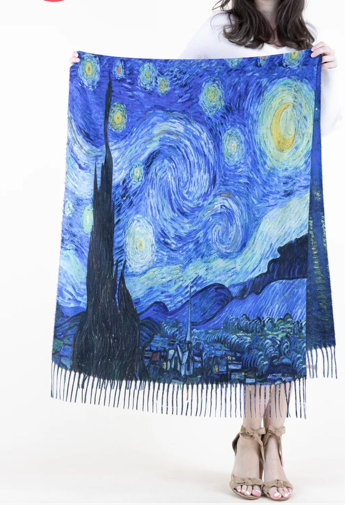 Wrap yourself in artistic inspiration with this exquisite double-sided museum print shawl celebrating Van Gogh's iconic Starry Night. Each side showcases the masterpiece's swirling brushstrokes and celestial beauty, allowing you to display your favorite perspective.