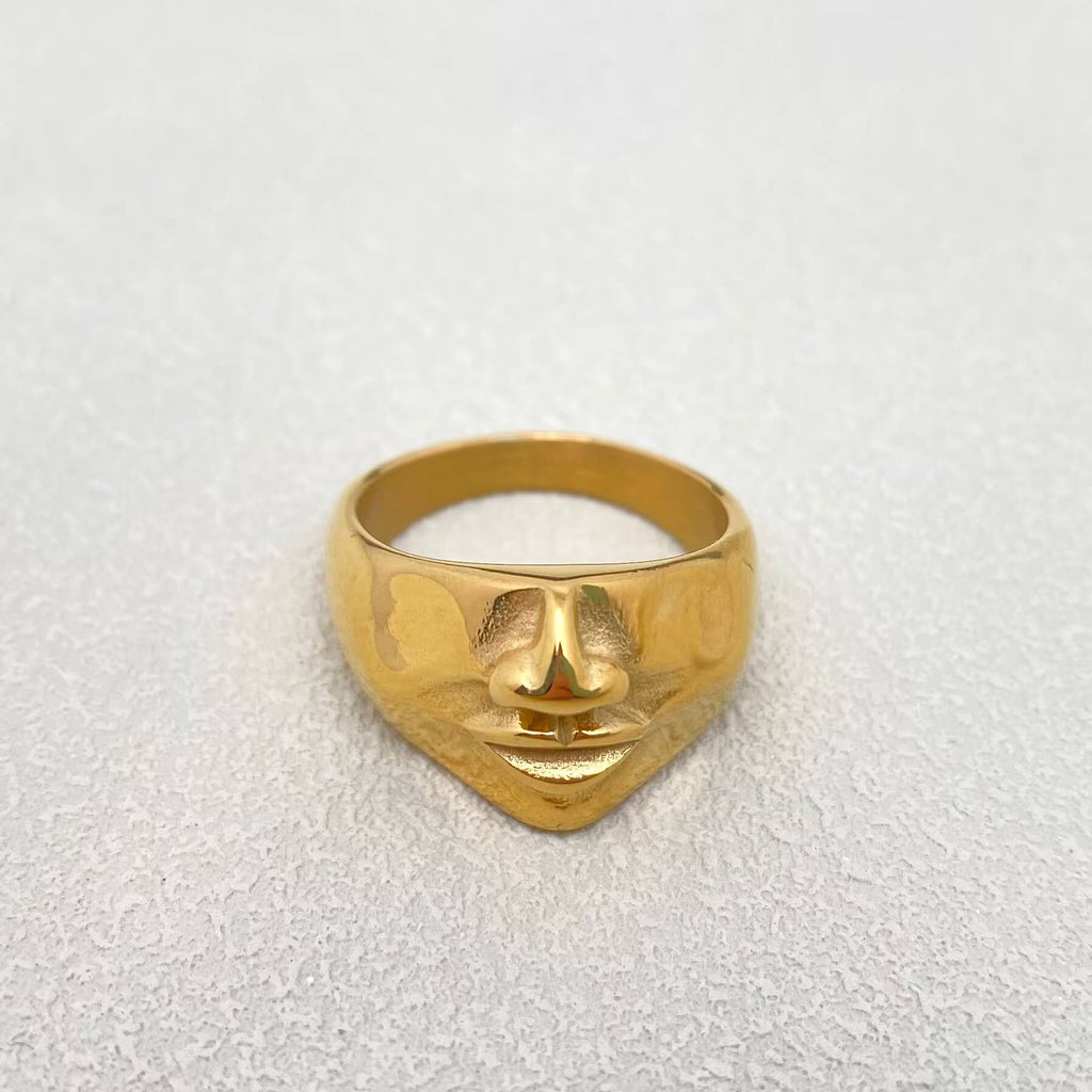 This abstract face ring is crafted from durable stainless steel and beautifully coated with 18K gold plating. Sized to fit perfectly—check our size chart for details. Featuring vacuum electroplating and hand polishing, it shines bright without tarnishing. Plus, it’s lead-free and finished with a sleek, high-polish surface for that extra sparkle!