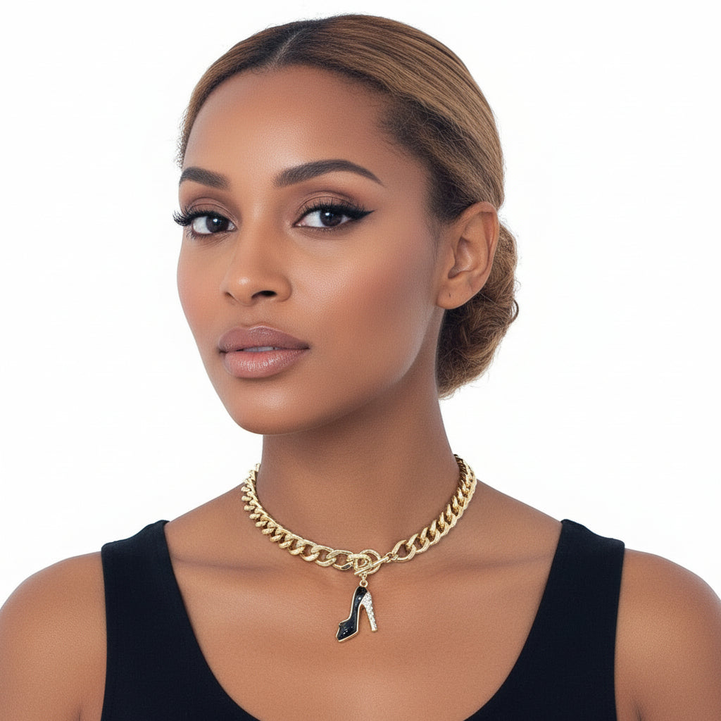 Make a bold fashion statement with this striking necklace that celebrates style and sophistication. Showcasing a charming black high heel adorned with shimmering rhinestones, this piece hangs from an elegant gold metal chain with a secure toggle closure. At 1.25 inches, the heel charm commands attention while remaining perfectly proportioned for everyday wear or special occasions.