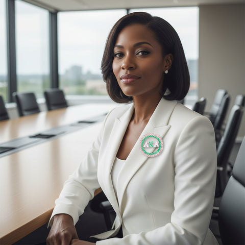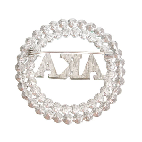 This women's brooch showcases a circular design crafted in silver metal, adorned with green pearl accents and a pink rhinestone border, highlighting the distinctive AKA Alpha Kappa Alpha detail. It secures easily with a safety pin C clasp, adding both style and practicality to your outfit.