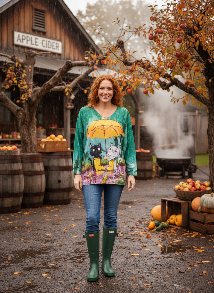 This light-knit sweater with a stunning graphic design features a relaxed fit and a flattering v-neckline. Designed with batwing sleeves and edges finished in silver lurex thread, it offers versatile style suitable for any season. Ideal for travel, this sweater is easy to pack and fits sizes M through XL. They also make the perfect gift.