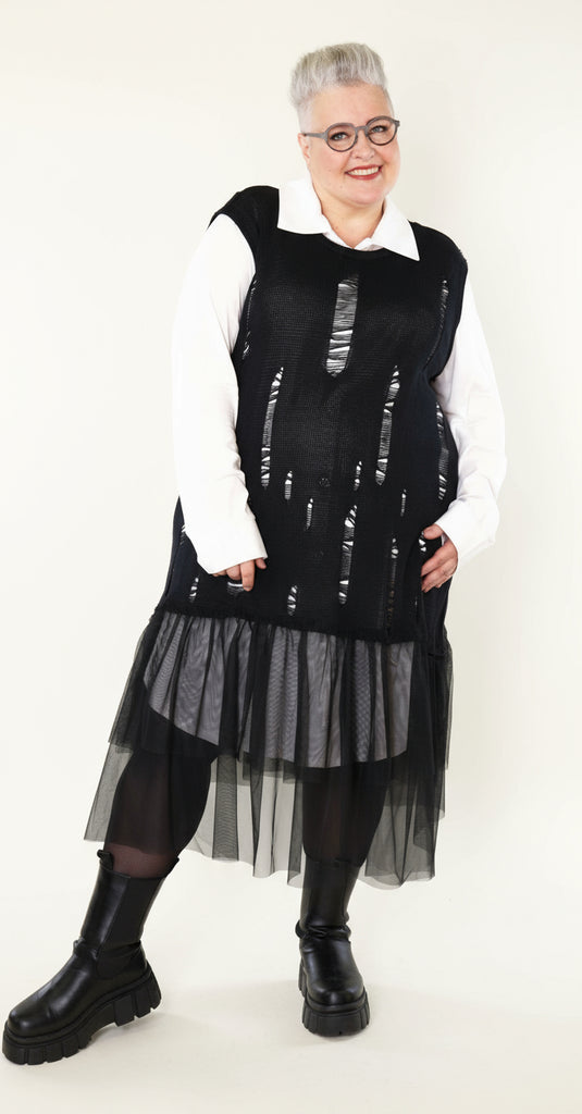 Elevate your wardrobe with this sophisticated Distressed Tulle Vest, expertly combining edgy design with delicate details. Crafted from a distressed knit fabric, it features a unique tulle hem that adds texture and femininity to your ensemble.