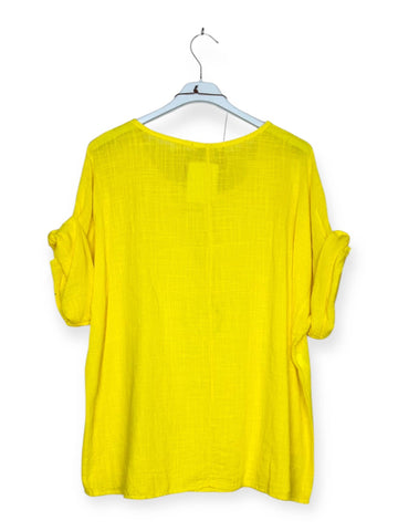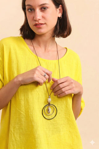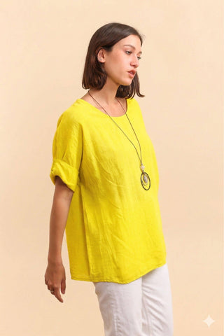 This top stands out for its loose fit and roll-up sleeves. With its round neckline and necklace detail, it adds a touch of softness and femininity to your outfit. The lightweight fabric and simple design make it a versatile piece, ideal for a casual or sophisticated look. Perfect for layering with accessories or additional layers, this top combines comfort and elegance for all occasions.