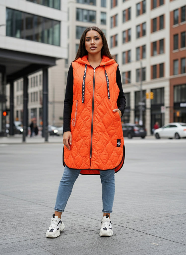 Make a bold statement with this eye-catching neon orange quilted vest that demands attention. The oversized silhouette offers comfortable layering over any outfit, while the attached hood provides extra coverage and style. Practical zip-front closure and dual pockets keep your essentials secure and accessible.