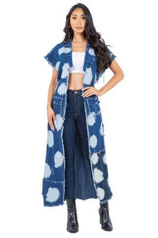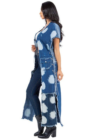 Make a bold statement with this edgy denim vest that combines contemporary style with functional design. The sleeveless silhouette features a multi-cut construction and convenient front pockets, while decorative lace-up chain detailing along the open sides adds an undeniable edge. Universally sized to flatter all body types, this versatile cover-up piece is your go-to for layering with attitude.