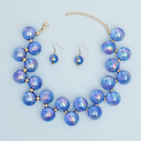 Women's Beaded Necklace Set. Royal Blue Iridescent Bubble Ball Acrylic Beaded Necklace Featuring Gold Metal Spacers and Floating Cluster Design. Beads measure 20mm. Lobster Clasp Closure. Includes Matching Fish Hook Drop Beads Earrings.
