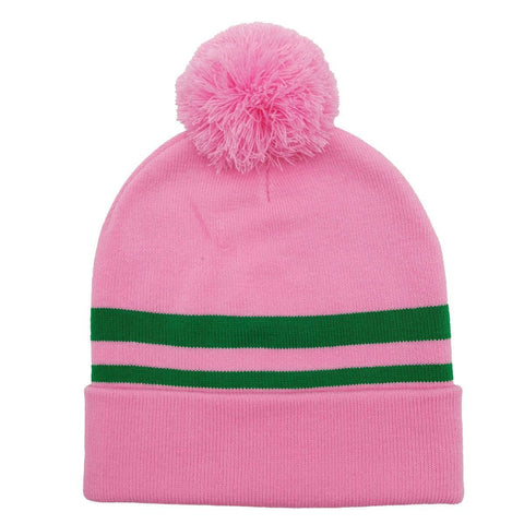 Sorority Inspired Pink Beanie Hat Featuring Two Green Stripe Detail and Pink Pom Pom. 100% Acrylic. Stretch to Fit. One Size. ** Hat Only.